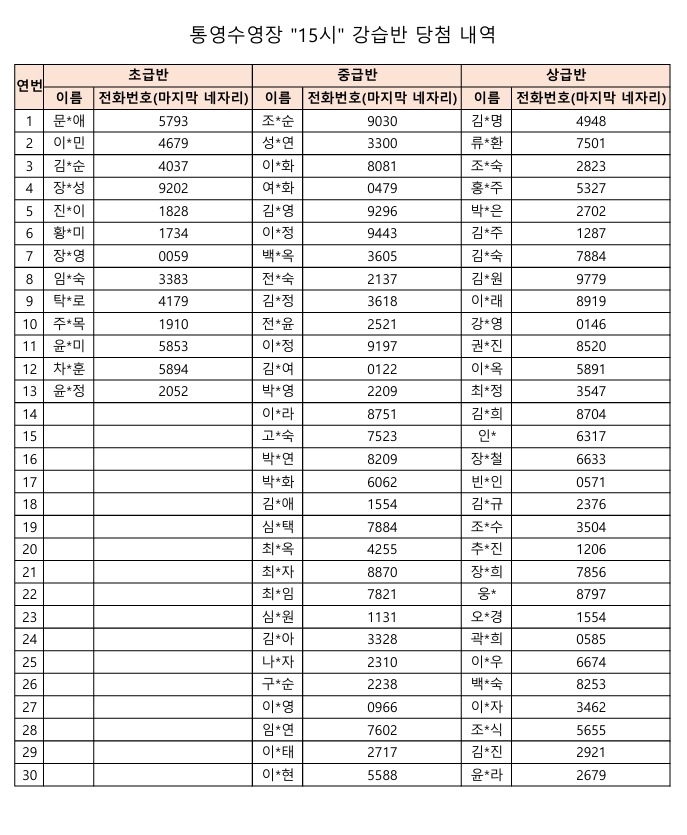 통영수영장 제2차 수영강습 추첨결과입니다.