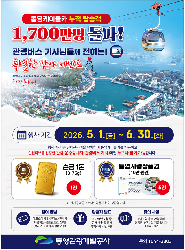 통영관광개발공사는 케이블카 누적 탑승객 1,700만 명 돌파를 기념하여, 단체관광객 유치의 일등공신인 관광 운수종사자(관광버스 기사)를 대상으로 대규모 경품 이벤트를 개최한다고 밝혔다.