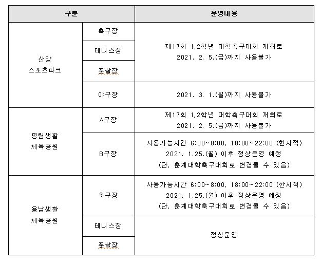 아울러 축구대회 개최 등으로 인해 체육시설이 제한적으로 운영되오니 아래 세부운영내용을 참고하시기 바랍니다.