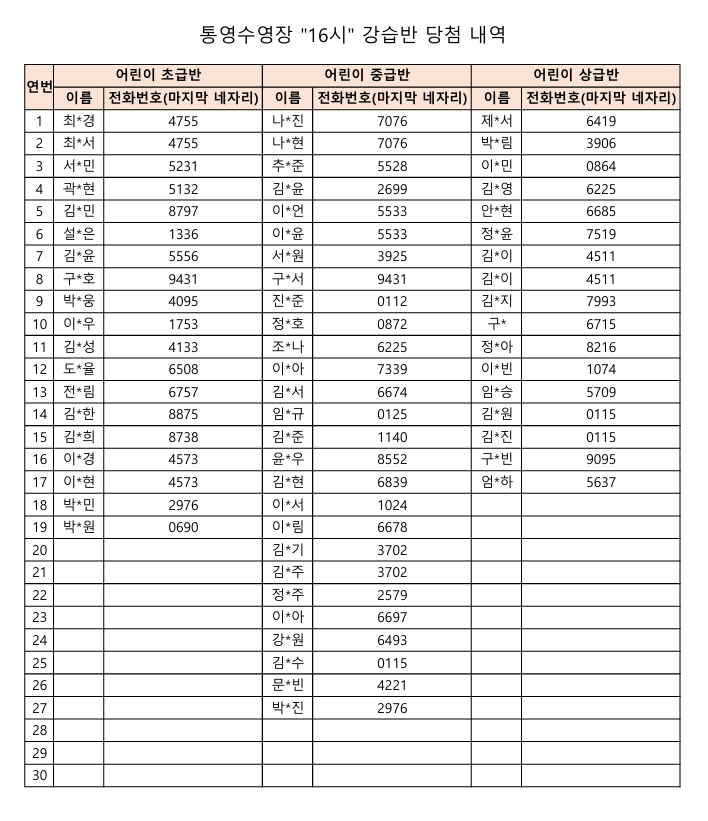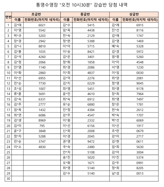 통영수영장 제2차 수영강습 추첨결과입니다.