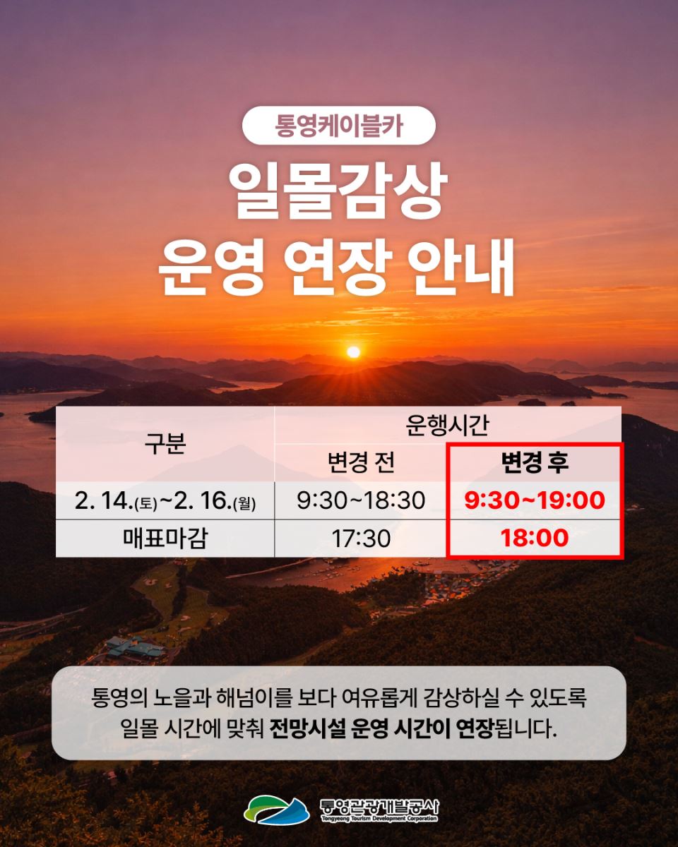 통영의 대표 관광시설인 통영케이블카에서는 오는 2월 14일(토)부터 16일(금)까지 3일간 케이블카를